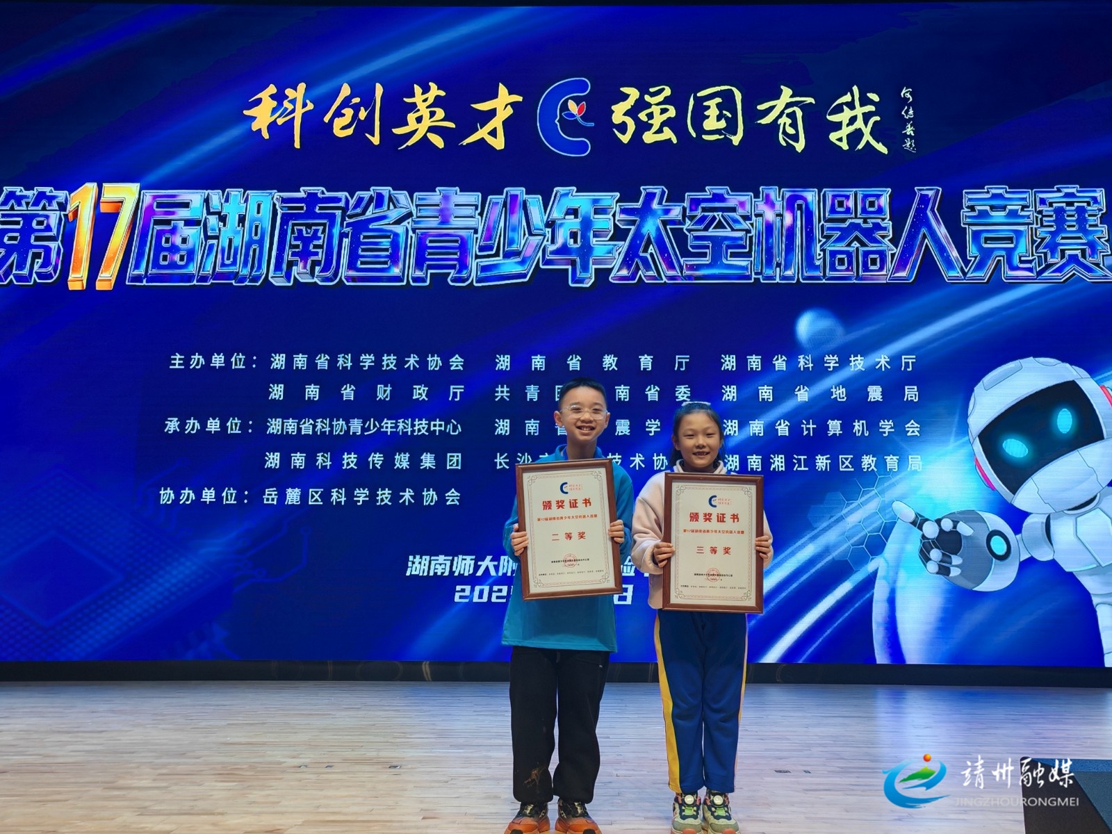 靖州融媒11月10日讯(通讯员 刘蕾)11月8日至9日,第17届湖南省青少年太空机器人竞赛在长沙举行,靖州苗族侗族自治县飞山小学两名学生经过市州选拔赛加入怀化市代表队参赛,五年级学生黄明峰在Scratch太空创意编程赛中获省级二等奖,四年级学生侯清菡斩获“震地奇兵”太空救援赛省级三等奖。