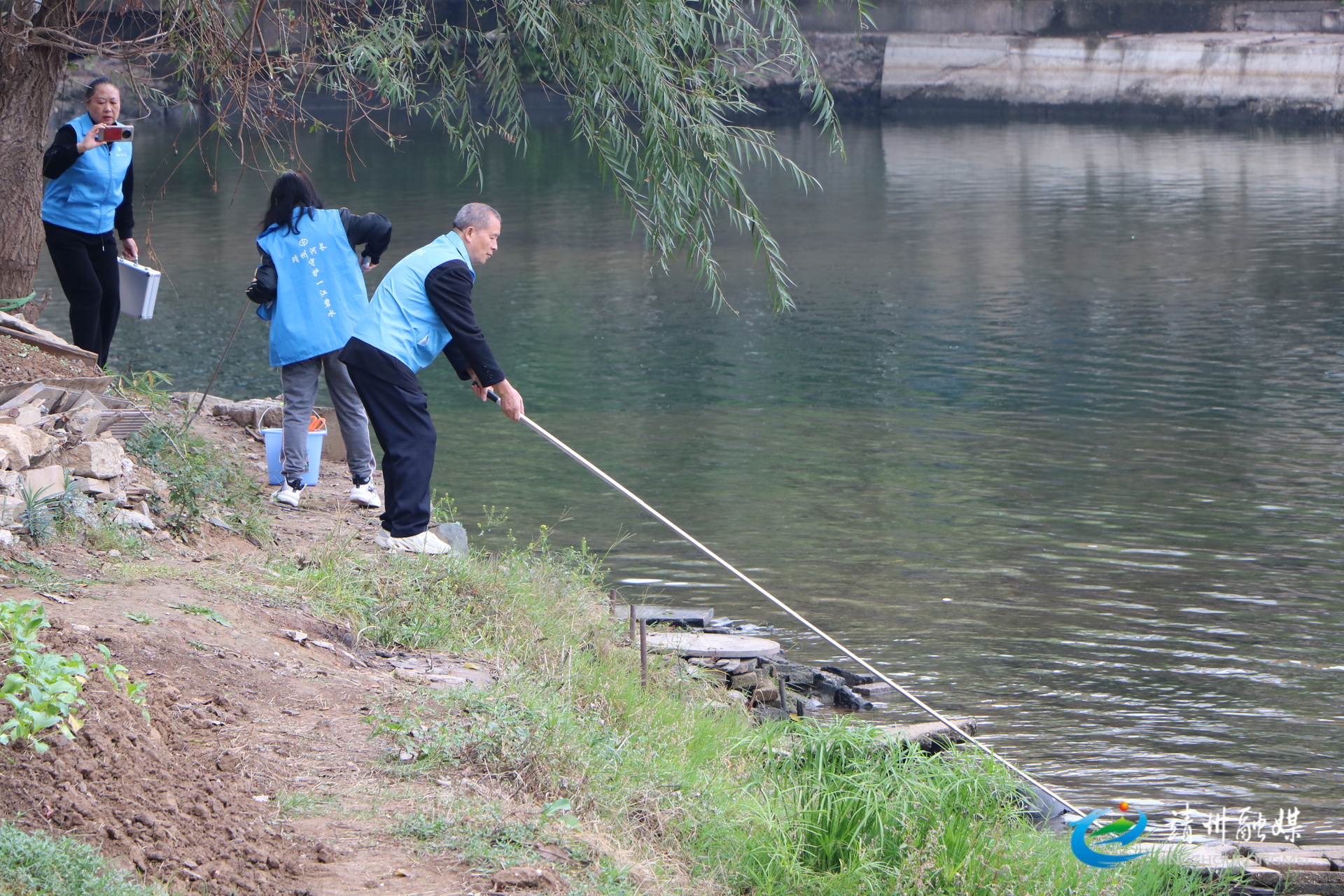 志愿者手持工具沿河道清理塑料瓶、包装袋等废弃物,以实际行动守护母亲河。
