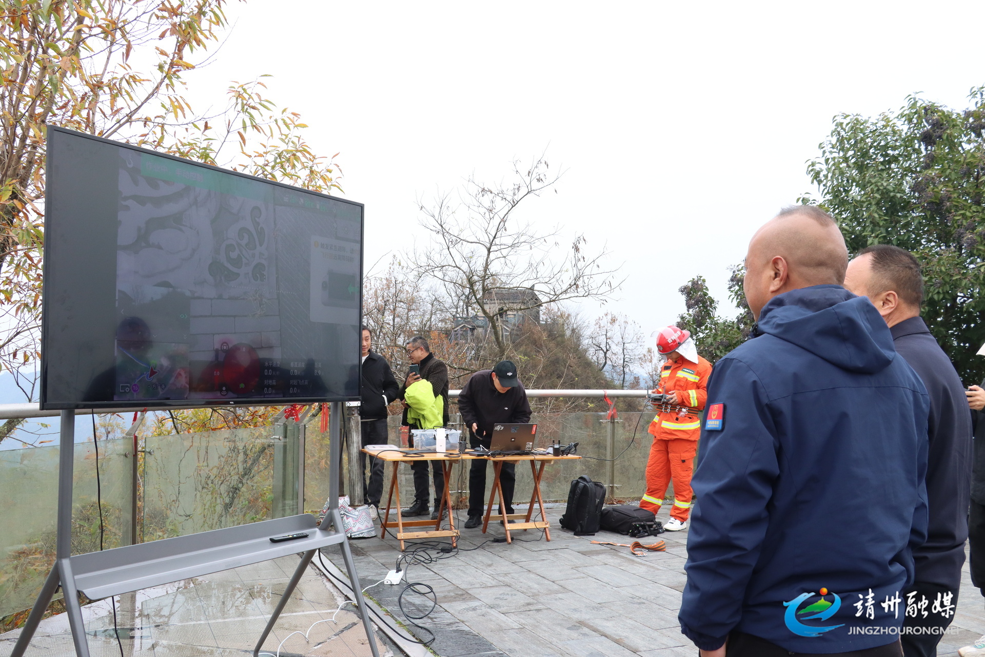 演练现场,靖州应急管理局、林业局模拟接到火警报警,迅速组织30名专业森林消防队员携带消防水车、无人机、消防水泵、油锯、风力灭火机等扑火机具赶往飞山景区火灾现场进行灭火,并成立临时指挥部,分无人机和视频探头迅速侦查火情、以水灭火、以火灭火、火线扑打、空中投弹等六个科目同时进行,成功将火扑灭。