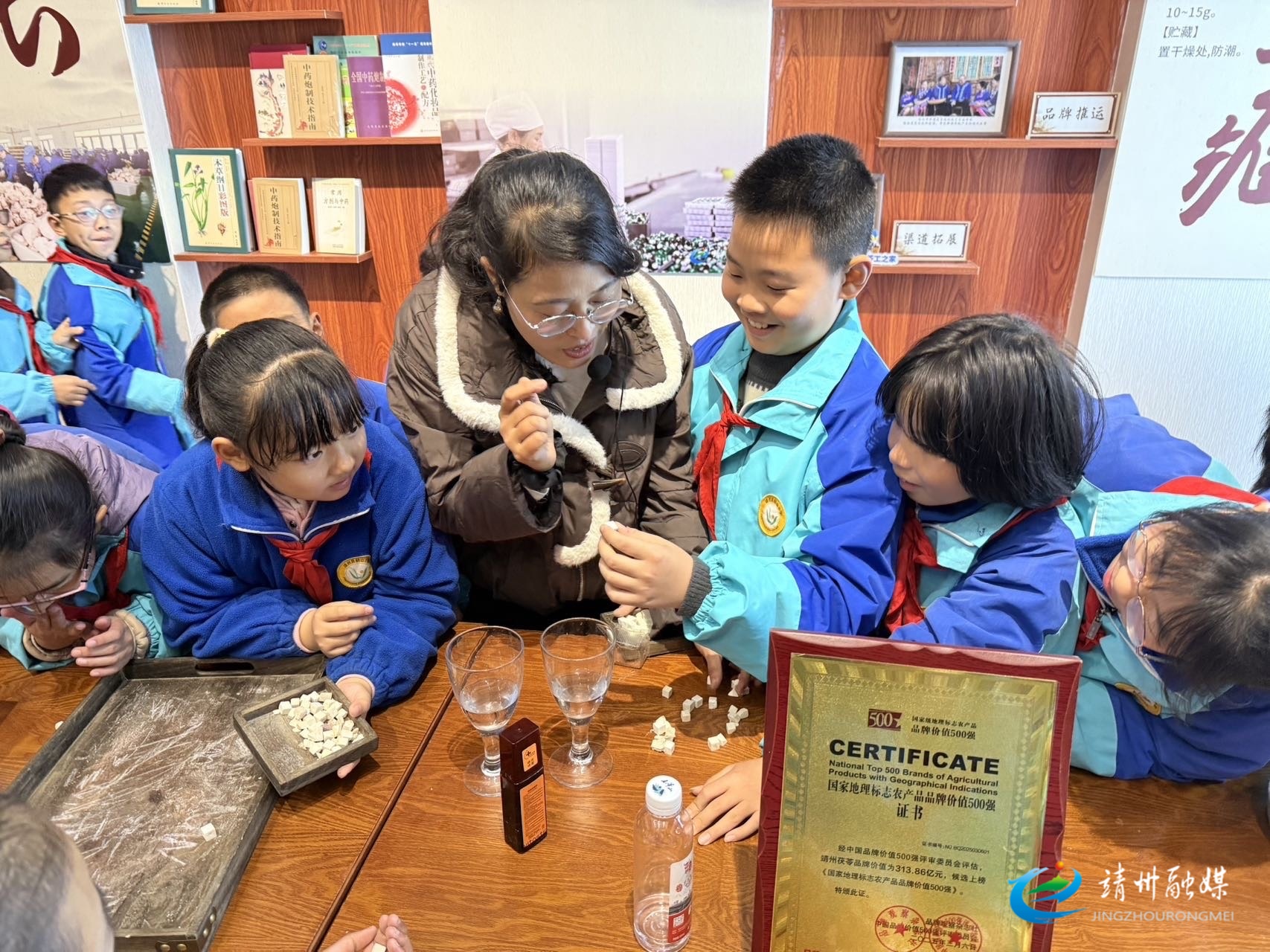 活动现场,党员教师率先参观茯苓加工全流程。在“国家地理标志产品”展示区,大家了解到靖州茯苓从传统种植到加工贸易的产业升级历程,感受乡村产业振兴成果。非遗体验厅内,工作人员现场演示“真假茯苓辨别”,通过观察质地、闻气味、试水溶解等方式,让少先队员直观认识道地药材特性。党员教师则结合“诚信经营”“品质强国”等主题,将思政教育融入实践体验。